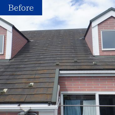 施工前は、雨染みなどの汚れが外壁に付着していてくくすんだ感じになっています。屋根にも藻の発生が見られました。また、スレートのひび割れなども補修が必要でした。