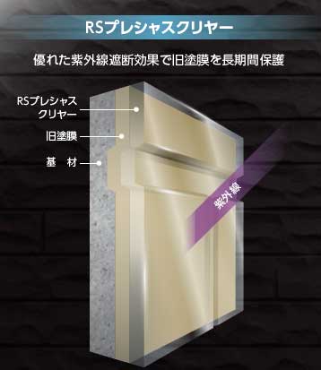 RSプレシャスクリヤーF・クリヤーは、紫外線の遮断効果がすぐれているため旧塗膜の意匠を長期間保護します。また、安定した付着性を維持することができます。