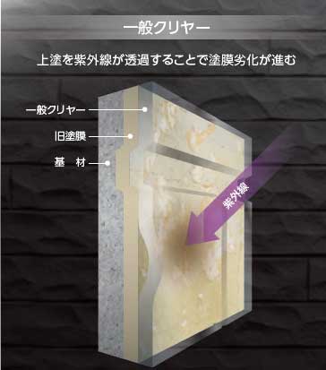 一般のクリヤーはエネルギーの強い紫外線を通過するため、旧塗膜は徐々に劣化し、色あせます。また、徐々に付着が低下し塗膜の剥がれにいたる可能性があります。